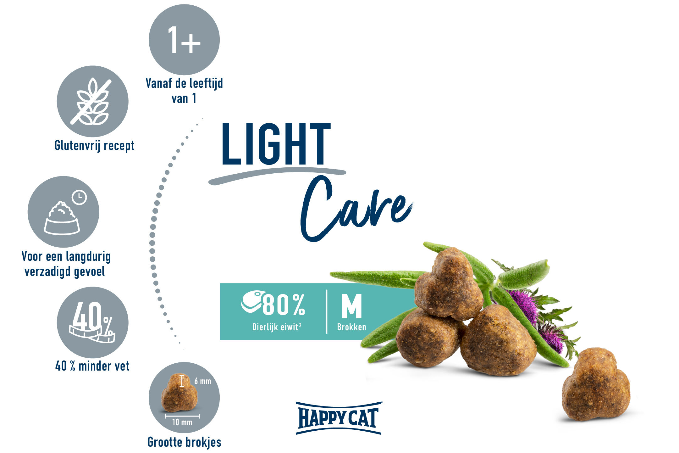 Als het gewicht van een kat 10 % boven het ideale gewicht ligt, spreken dierenartsen van licht overgewicht. Dan is Happy Cat Care Light een goede keuze. Net als bij katten die erg traag zijn en daarom voeding met een lager energiegehalte nodig hebben of wanneer je kat afgevallen is en je een geschikte opvolgvoeding zoekt. Als je kat door een verwonding of een operatie een tijd minder kan bewegen dan gewoonlijk, is het nuttig om gedurende deze periode Happy Cat Care Light te geven, om een toename in gewicht te voorkomen.