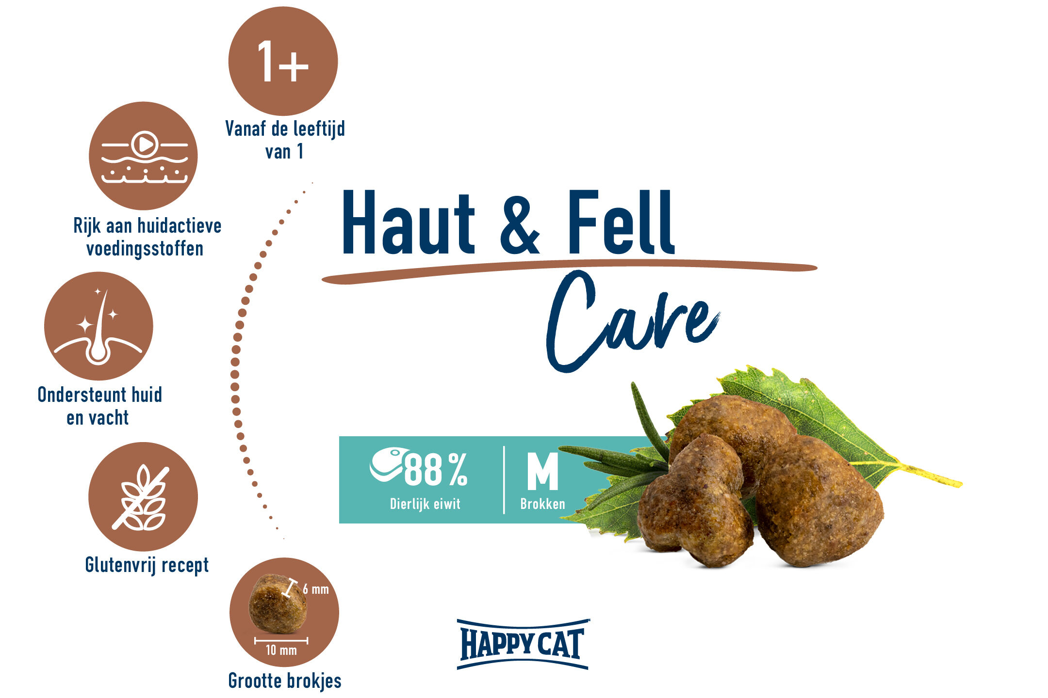 Bij oudere katten, na een verwonding, na een operatie of bij overgewicht kan het gebeuren dat katten zich niet zoals gewoonlijk kunnen verzorgen. Een regelmatige vachtverzorging is echter belangrijk voor een gezonde huid en een glanzende vacht. Wordt de vacht onvoldoende verzorgd, dan wordt de vacht sneller vettig en ongevoeliger en kan het samenklitten.  Door Happy Cat Care Haut & Fell te geven, ondersteun je de huidstofwisseling van je kat, wat de kwaliteit van de vacht kan verbeteren. Bovendien kun je je kat helpen bij de vachtverzorging door hem regelmatig zacht te borstelen.