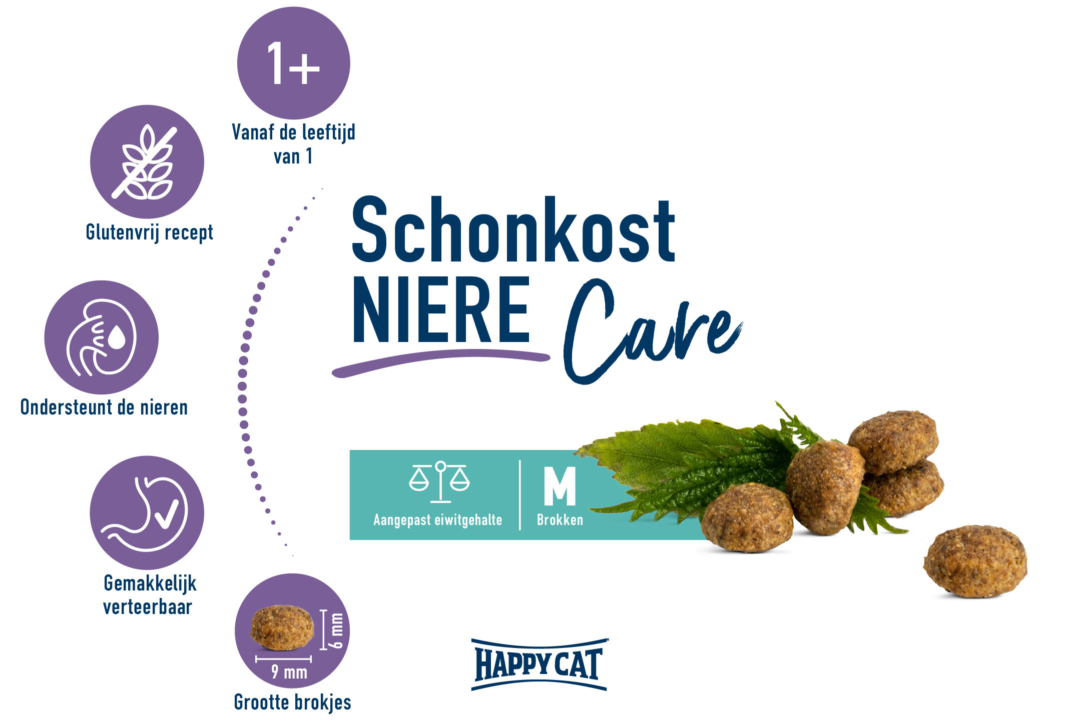 Happy Cat Care Schonkost Niere is vooral geschikt voor het voeren van katten in een vroeg stadium van nierinsufficiëntie. Houd er rekening mee dat het vereist is dat een dierenarts deze diagnose stelt.