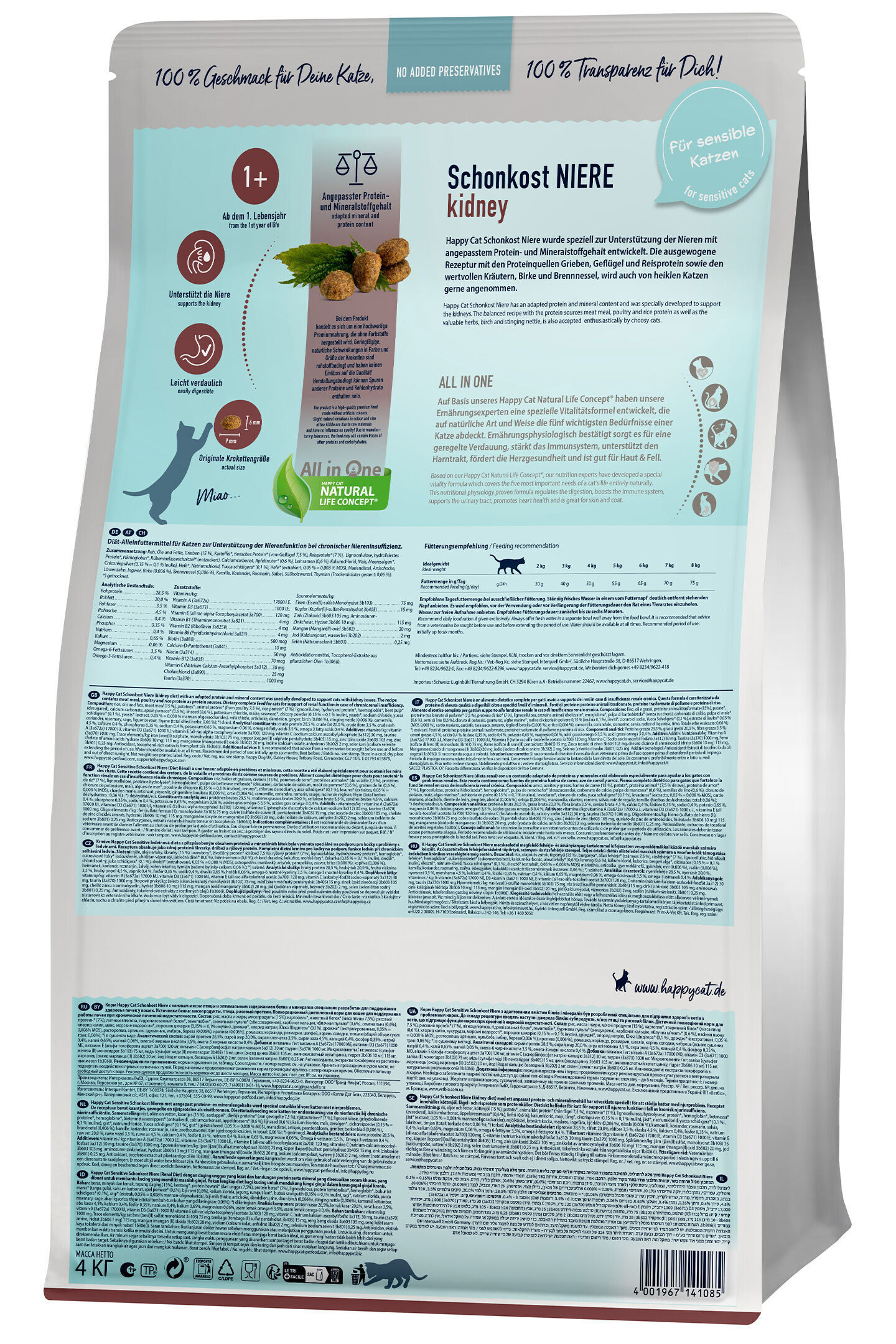 Happy Cat Care Schonkost Niere werd speciaal ontwikkeld ter ondersteuning van de nieren door een aangepast proteïne- en mineralengehalte. Zelfs kieskeurige katten eten de evenwichtige receptuur met de proteïnebronnen gevogelte en kaantjes en waardevolle kruiden graag.