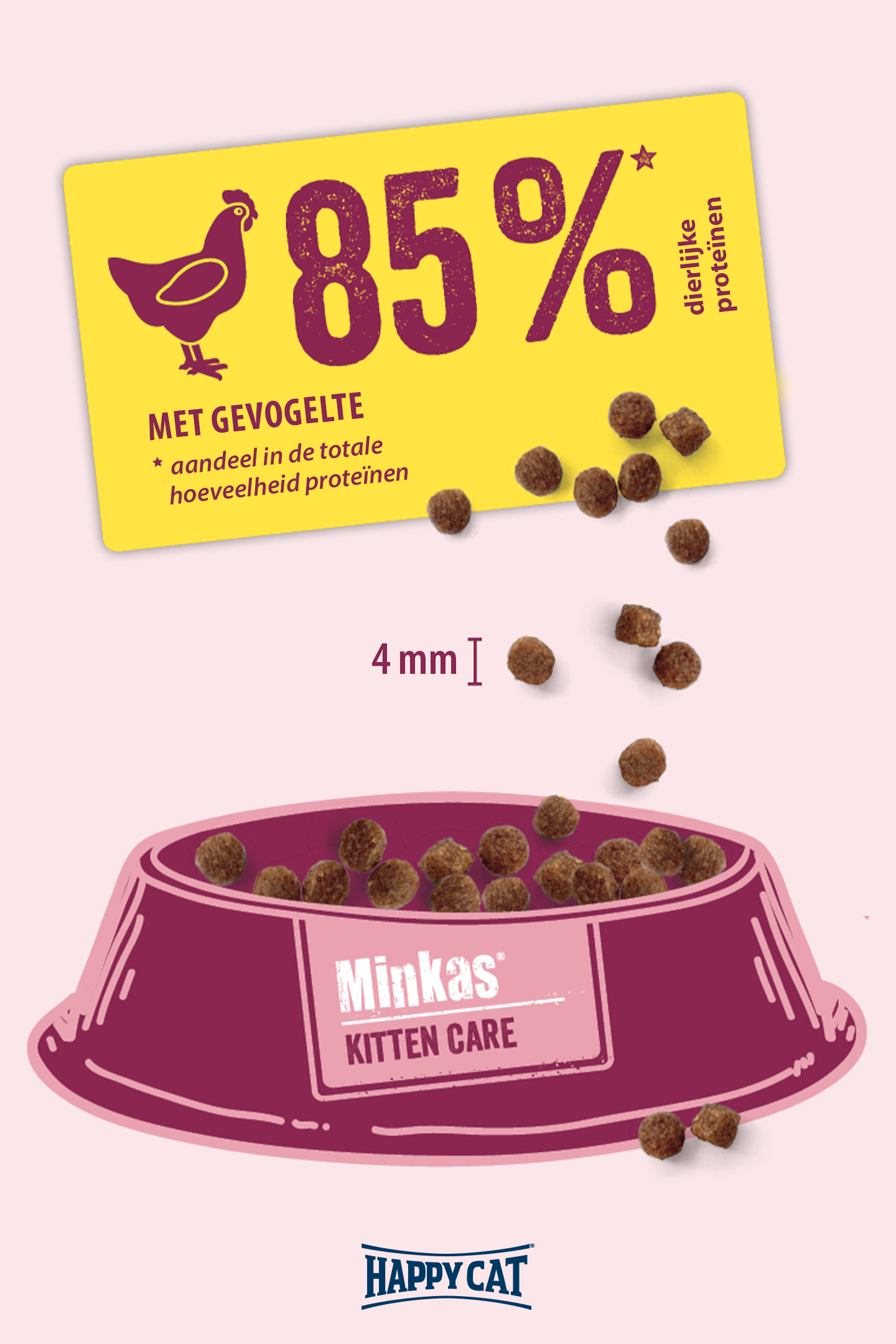 Onze Happy Cat Minkas Kitten Care zorgt dankzij de waardevolle proteïnen en hoogwaardige ingrediënten zoals omega-3 en omega-6 vetzuren voor een allround harmonische groei - 100 % evenwichtig en natuurlijk. De receptuur met lekker gevogelte is speciaal aangepast aan de behoeften van jonge katten. Het totaalvoer is ideaal vanaf 5 weken en geeft uw viervoeter alles , wat hij nodig heeft. Het smaakvolle droogvoer is rijk aan veel vitamines en een aan de groei aangepast gehalte aan mineralen en ondersteunt het immuunsysteem. Natuurlijk zijn onze recepturen vrij van kunstmatige geur- en conserveringsmiddelen.