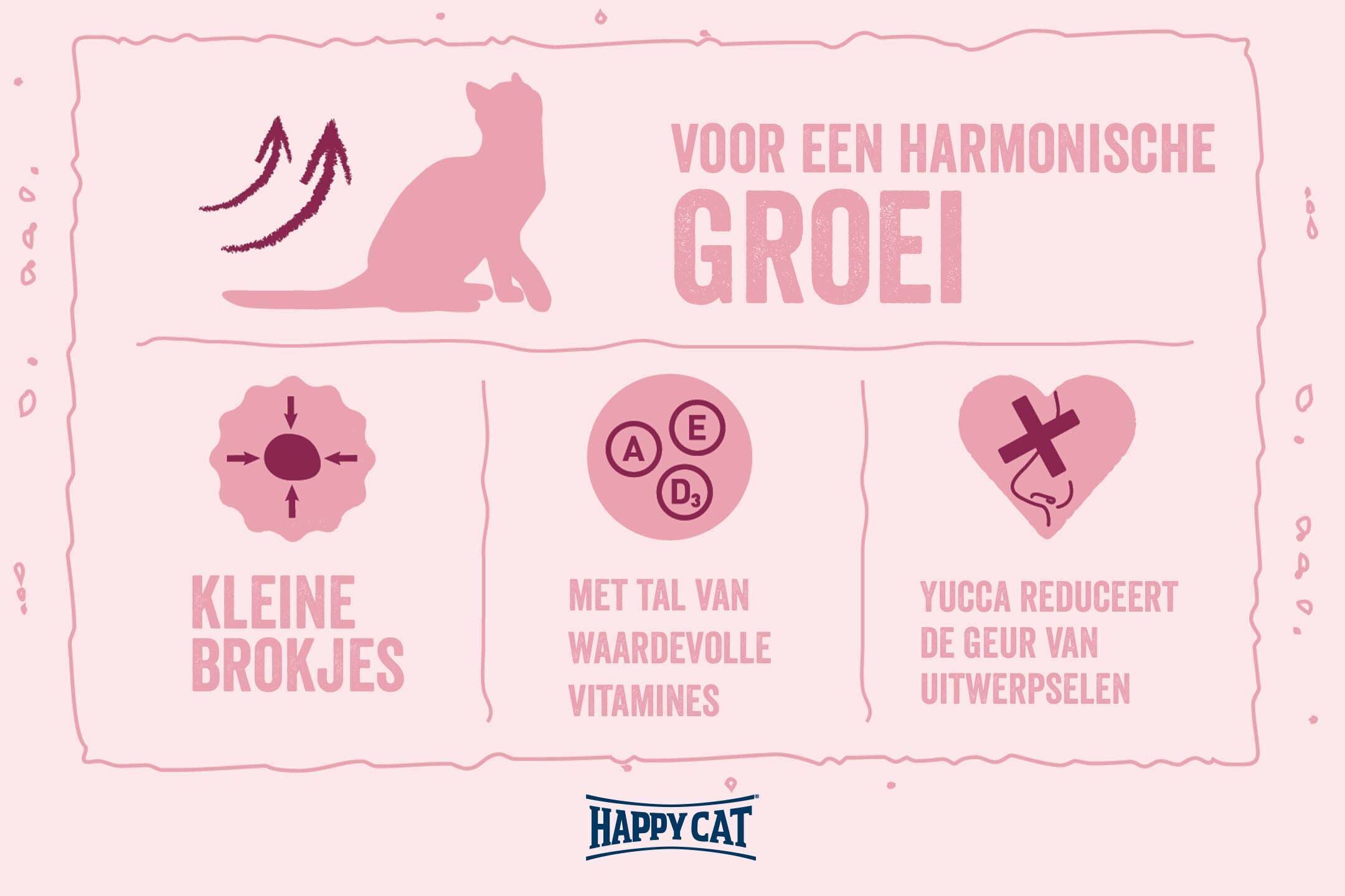 Zorg voortdurend voor vers water in een bak die op een behoorlijke afstand staat van de voerbak. Door de verschillende individuele behoefte van afzonderlijke katten kan de vermelde hoeveelheid met max. 15 % worden verhoogd of verlaagd. Schakel uiterlijk op 6 maanden over op een geschikt Happy Cat Junior voer.