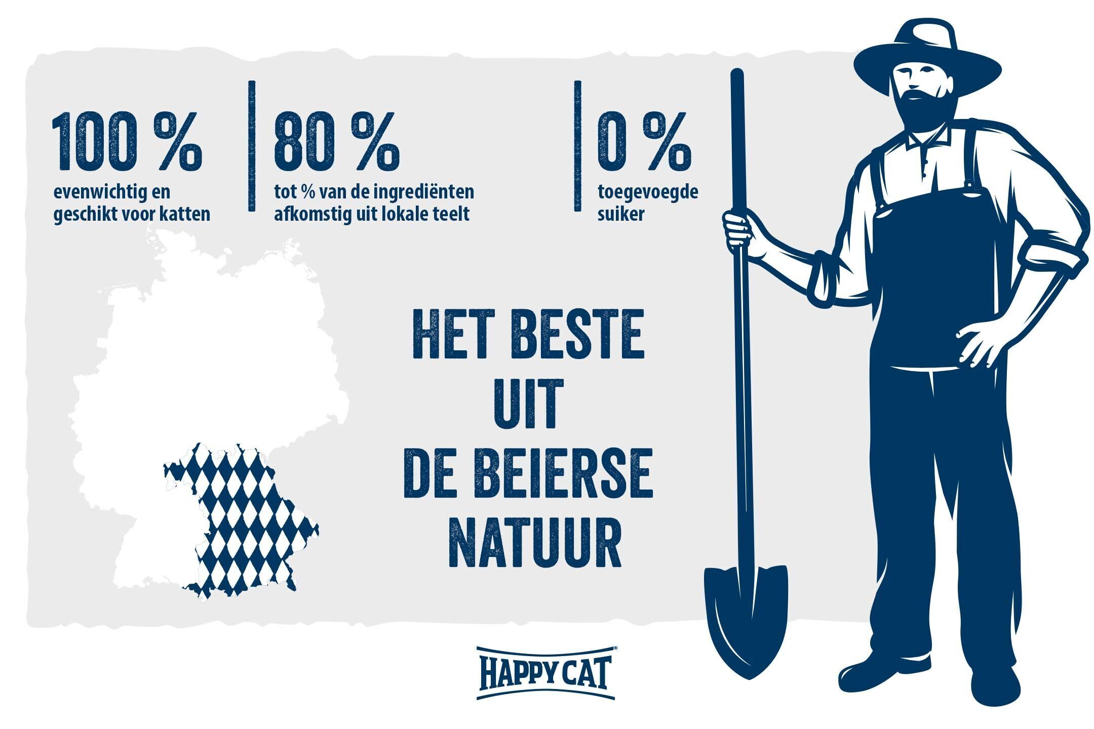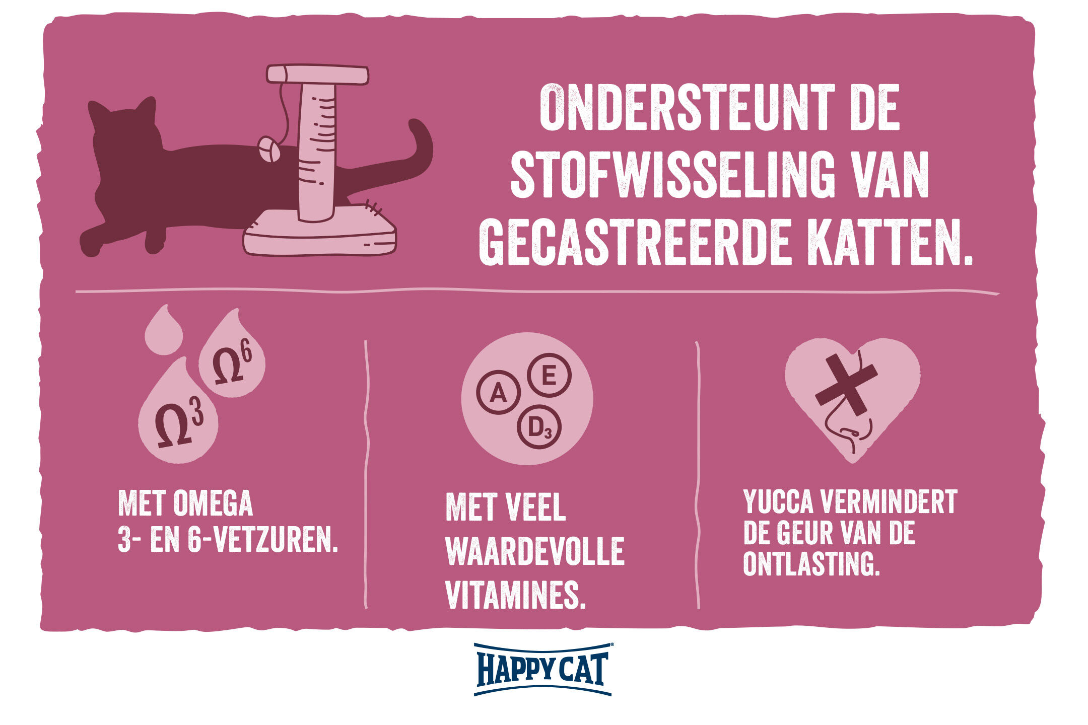 Onze Happy Cat Minkas Sterilised Geflügel is speciaal aangepast aan de behoeften van gecastreerde katten. De evenwichtige totaalvoeding helpt met haar verlaagde vetgehalte en het optimale aandeel verzadigende voedingsvezels het ideale gewicht van uw kat te behouden. Onze receptuur met een groot aandeel waardevolle dierlijke proteïnen is 100 % evenwichtig en natuurlijk. Het smaakvolle droogvoer is rijk aan vele vitamines en mineralen en ondersteunt het immuunsysteem. Natuurlijk zijn onze recepturen vrij van kunstmatige geur- en conserveringsmiddelen.