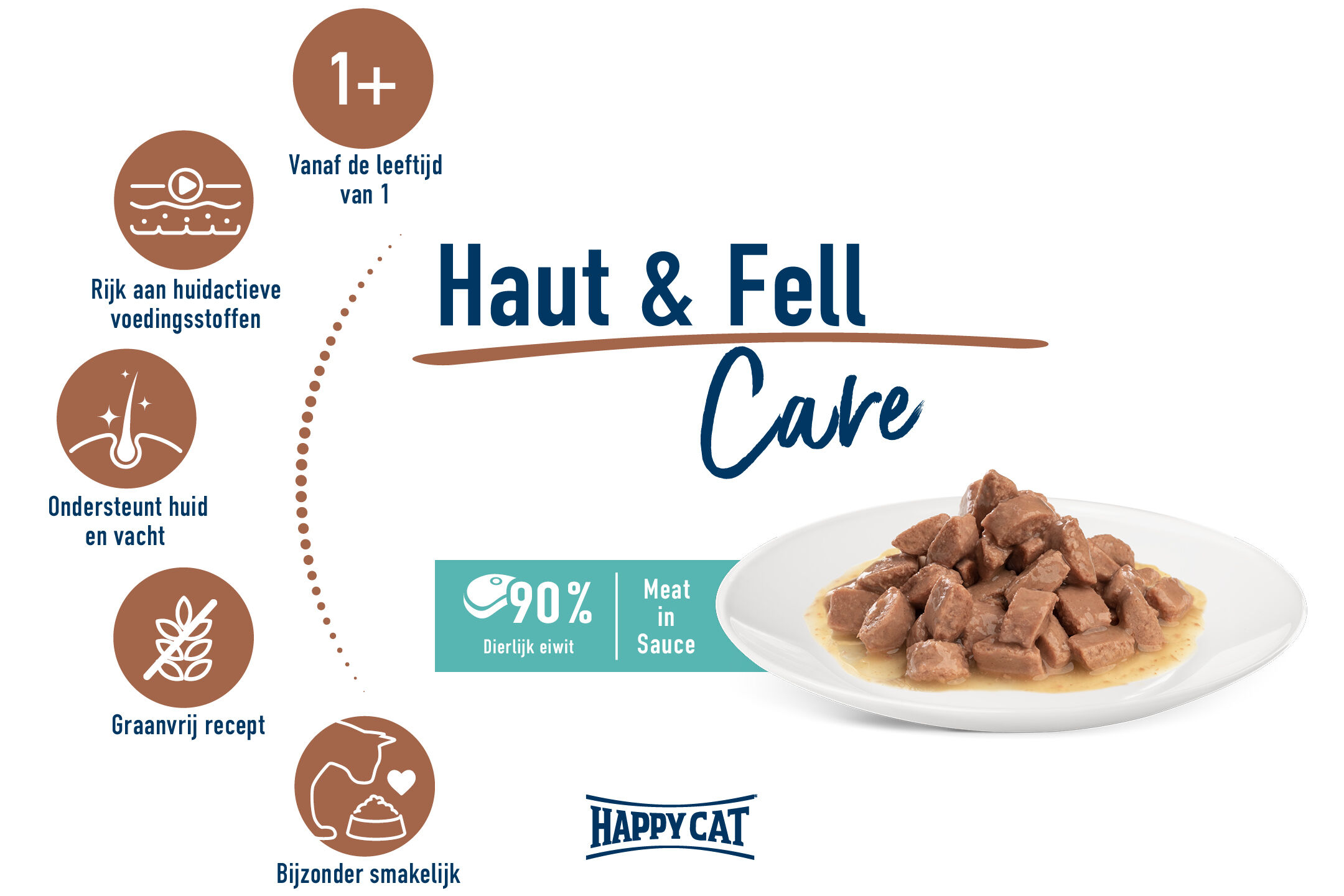 De lekkere receptuur met gevogelte in een fijn sausje van Happy Cat Haut & Fell bevat geen granen, maar wel belangrijke huidactieve voedingsstoffen, die een natuurlijk glanzende vacht en de huid ondersteunen. Vacht werd speciaal voor katten met een gevoelige huid. Op basis van ons Happy Cat Natural Life Concept® hebben onze voedingsexperts een speciale vitaliteitsformule ontwikkeld die op natuurlijke wijze aan de vijf belangrijkste behoeften van een kat voldoet. Het voedingsfysiologisch bewezen concept zorgt voor een geregelde spijsvertering, versterkt het immuunsysteem, ondersteunt de urinewegen, helpt het hart gezond te houden en is goed voor huid & vacht.